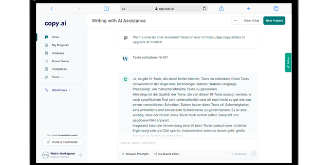 Copy.ai ist eine Plattform, die Künstliche Intelligenz (KI) nutzt, um bei der Texterstellung zu unterstützen. Mit Copy.ai können Nutzer*innen Texte automatisch generieren, indem sie einfach eine kurze Beschreibung oder eine Überschrift angeben. Die Plattform verwendet fortschrittliche KI-Modelle, um alternative Textversionen, Anzeigenkreationen, Blogartikel und mehr zu generieren.